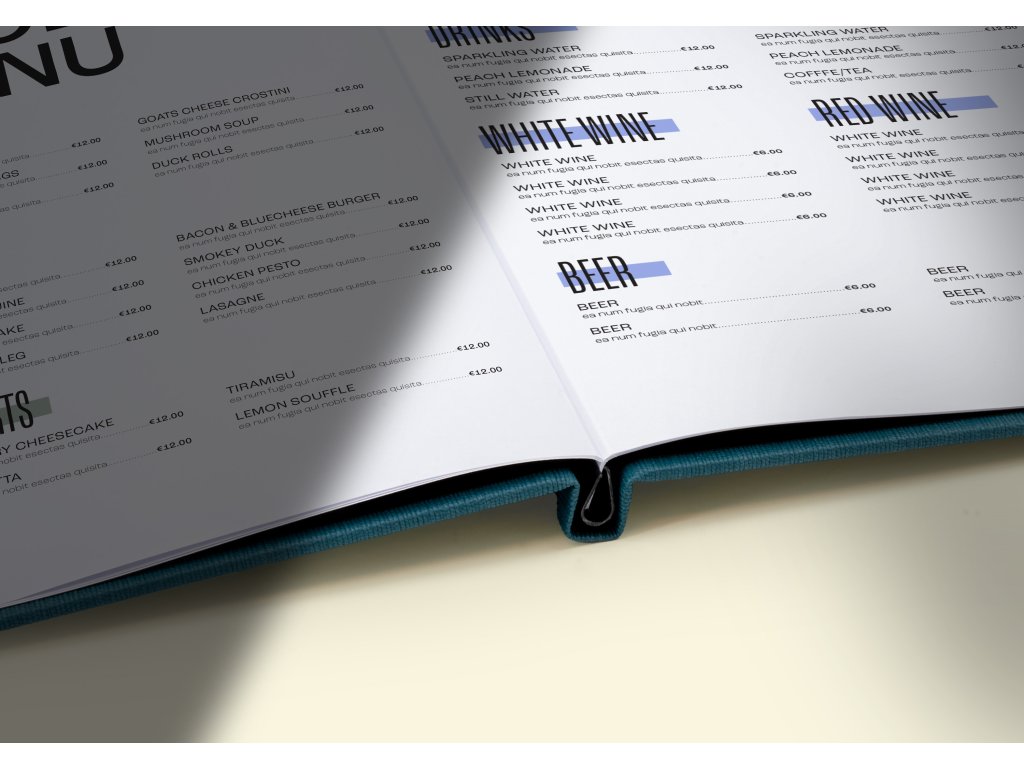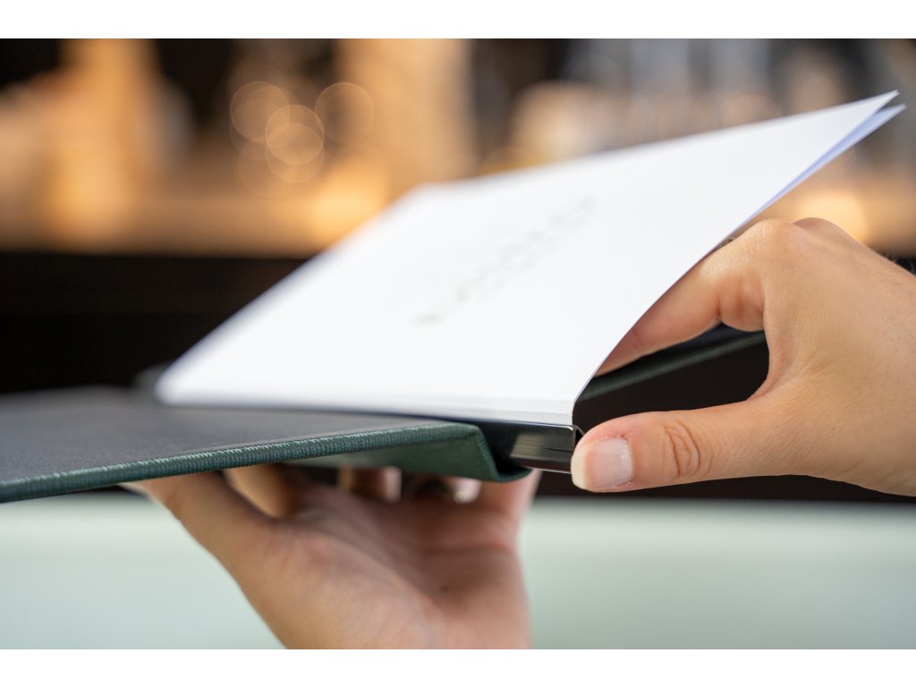 Unikátní řešení z Belgie, se kterým aktualizujete obsah do 20 vteřin. Tyhle menu desky mají ve hřbetu násuvnou lištu – jednoduše ji vysuňte, nasuňte výtisk a vraťte do desek. Menu lístek připraven! Stejně jednoduše změníte i jen část nabídky. Nebo klidně jeden list.
